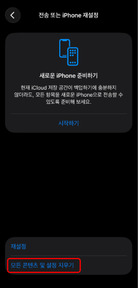 4. 화면 맨 밑에 있는 [모든 콘텐츠 및 설정 지우기]를