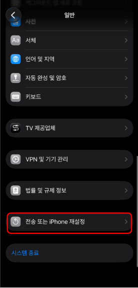 [전송 또는 iPhone 재설정]을 눌러주세요.