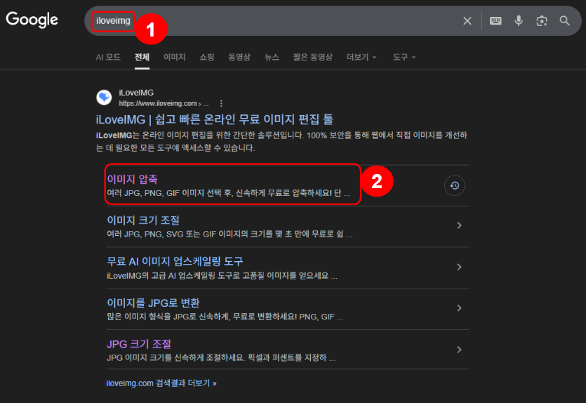 3. 이제 본격적으로 이미지 용량을 줄여보겠습니다. 구글 검색창에 'iloveimg'를 검색한 후, 공식 사이트의 [이미지 압축] 메뉴로 들어갑니다.