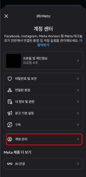 2. 메뉴 상단에 있는 [계정 센터]로 들어가 줍니다.