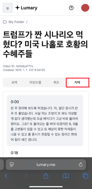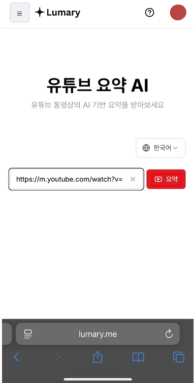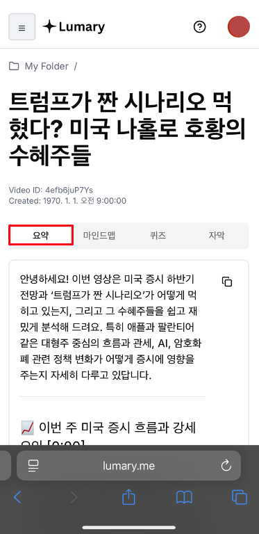 3. Lumary 사이트로 자동 접속됩니다. 로그인 후 ‘요약’ 버튼을 클릭하면 해당 영상이 요약됩니다.
