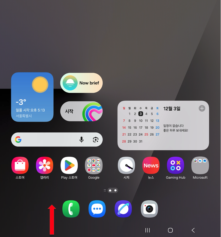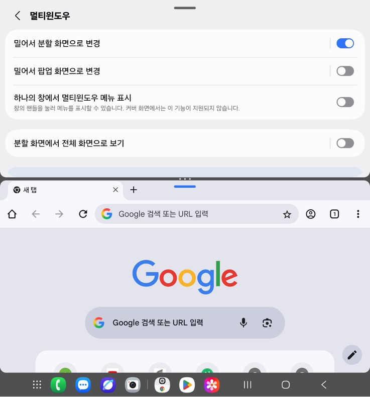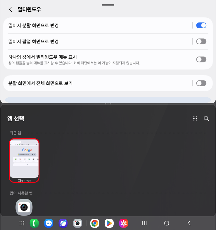 화면 아래에서 위로 손가락 두 개를 동시에 밀어 올리면 화면이 분할됩니다.