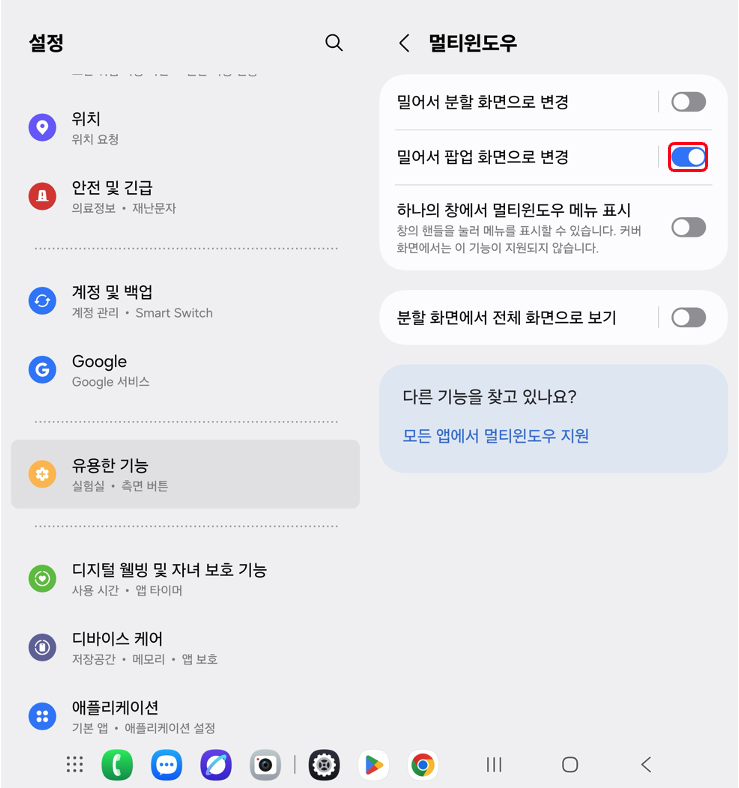 오늘은 설정 > 유용한 기능에 있는 화면 분할 관련