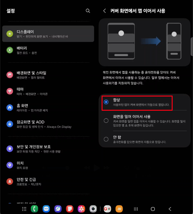 이렇게 설정하면, 메인 화면(큰 화면)에서 사용 중이던 앱을 폴드를 닫아도 커버 화면에서 그대로 이어서 사용할 수 있습니다.